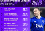 根据Squawka的统计,格拉利什是本赛季被犯规次数最多的球员。