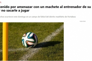 据马德里高级警察总局通报,事件发生在本周日,位于马德里奥尔塔莱萨区的一处足球场附近。被捕者与其儿子的足球教练发生激烈争吵,多名目击者向警方证实该男子曾手持砍刀作出暴力姿态。