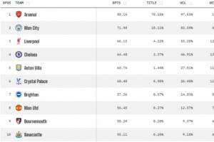 数据机构Opta的大数据预测再度进行更新,目前英超各队的夺冠概率:阿森纳夺冠概率升至70.18%,曼城18.11%;利物浦4.22%,切尔西3.47%。该榜单的第5名为1.44%的维拉,其余球队夺冠概率均不足1%。