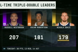 这样一来,他职业生涯的三双总数来到179次,距离历史第二多的“大O”奥斯卡·罗伯特森只差两场,距离历史第一的威少还差28场。
