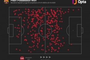 数据统计显示,佩德里在2025年各项赛事共计346次夺回球权,是五大联赛同期非门将球员最多。