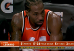伦纳德在前三节出战了32分29秒,投篮24中17,三分9中5,罚球13中12,得到51分8篮板1助攻5抢断3盖帽。