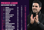 而据OPTA统计,在英超2025全年积分榜上,阿森纳39场83分高居第一,曼城少赛两场积80分排第二,维拉、利物浦、切尔西少赛一场分列三至五名。
