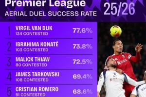 体育资讯1月3日讯 数据机构squawka统计了本赛季英超争顶成功率情况,利物浦双中卫包揽前二。