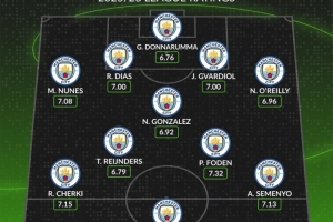 后卫:努内斯(7.08分)、鲁本·迪亚斯(7.00分)、格瓦迪奥尔(7.00分)、奥赖利(6.96分)
